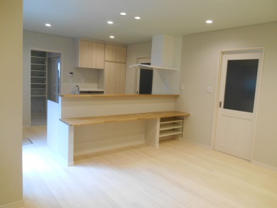 無垢の床材にコーディネートしたキッチンが中心のLDK、白を基調とした清潔感のある明るい空間に仕上げりました。