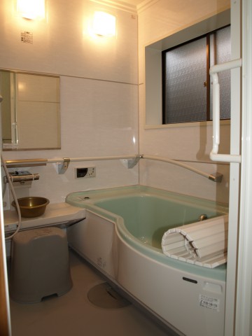 ご夫婦が二人とも高齢になられ、安心してお風呂に入りたいとのことでご相談いただきました。カウンターから浴槽までぐるっと手すりがついているので安心してご入浴できるようになりました!