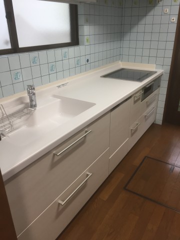 お客様の要望でキッチン周りの水色の絵柄が入ったタイルを残してキッチンを新しいものに。ユニットバスも暖房付き換気扇にして、さらに内窓をつけて冬でも寒さを感じないあったかいお風呂にさせていただきました!